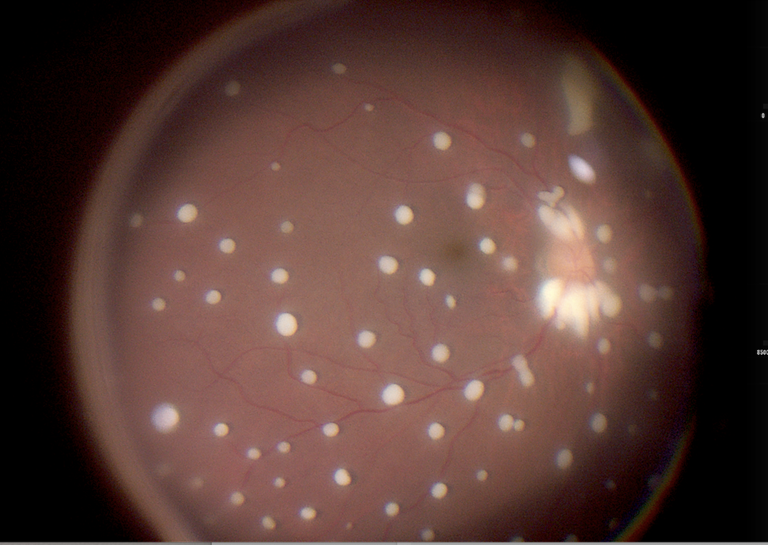 Intra Operative Photo of Fundus with Multiple Fungal Seedings